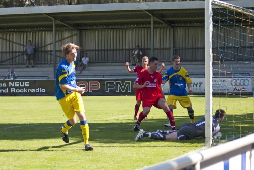 In der ersten Hälfte der ersten Halbzeit konnte der SC Fürstenfeldbruck trotz eifrigen Bemühens keine nennenswerten Torchancen erspielen. Der Gegner verteidigte mit Mann und Maus und suchte sein Heil in langen Bällen, die dann auch aufgrund von Mängeln im Abwehrverhalten zum Torerfolg führten. So in der 15. Minute durch Sebastian Schwegle, der im Nachschuss zum 0:1 einlochte. Das 0:2 erledigte in der 21. Minute Adnan Akyel , der Sebastian Schmeiser überlief und am chancenlosen Lukas Welzmüller vorbei vollendete. Die Brucker ließen aber die Köpfe nicht hängen und wollten den Anschluss-treffer noch vor der Pause. Dies gelang mit etwas Glück in der 35. Minute, als Alex Hollering einen Schuss auf das Thannhauser Tor abfeuerte. Dem etwas verunglückten Ball konnte Thomas Krovinovic mit dem Fuß noch eine andere Richtung geben,so dass er unhaltbar für den Gastekeeper zum 1:2 einschlug. Bereits drei Minuten später gab es einen Freistoß aus etwa 18 Metern, den Christian Lippert mit einem fulminanten Schuss ausführte. Der Gästetorwart Thomas Böld konnte den scharfen Schuss nicht festhalten, so dass Armin Lange mit seinem sechsten Saisontreffer zum Ausgleich abstauben konnte. In der zweiten Hälfte wurde das Spiel auf beiden Seiten schwächer, auch bedingt durch die sengende Hitze. Doch Thannhausen hatte aufgrund der bereits in Hälfte eins praktizierten Spielweise - hinten dicht und mit langen Bällen nach vorne - noch ein paar sehenswerte Chancen, die der gut aufgelegte Lukas Welzmüller alle zunichte machte.