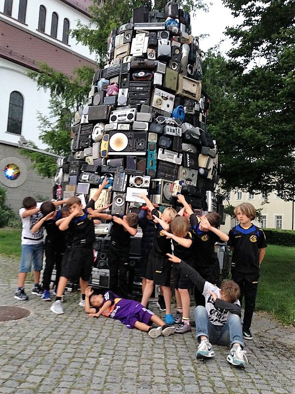 Direkt nach dem Duschen und der Siegerehrung ging es nach Salzburg zum Bezug der Jugendherberge. Im Anschluss an das Abendessen erkundeten wir die umliegende Gegend und entdeckten ein seltsames Gebilde aus nostalgischen Tonabspielgeräten. Zurück im Hotel sollte dann eigentlich um 22:00 Uhr Bettruhe sein; aber für viele Kinder war es die erste Übernachtung in einer Herberge und das Einschlafen dauerte etwas länger. Früh am nächsten Morgen erfolgte die Abreise zum nächsten Turnier in Eberschwang.